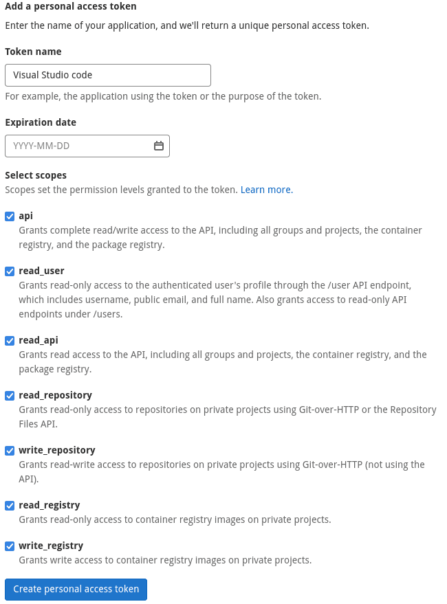 We will create a new access token that has all available rights or scopes so Git and Visual Studio Code can interact with gitlab.oeaw.ac.at. We enter a descriptive Token Name