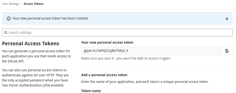 we see this new generated password in our browser. As the text clearly states we won’t be able to see it again. If we need access for another tool we just create a new access token.