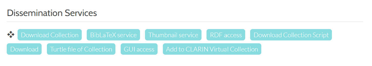 Mithilfe der “Dissemination Services” hat man die Möglichkeit, die Daten der Sammlung herunterzuladen, ihre Metadaten und auch die einzelnen Dateien in verschiedenen Formaten anzuzeigen und mit ihnen zu arbeiten.