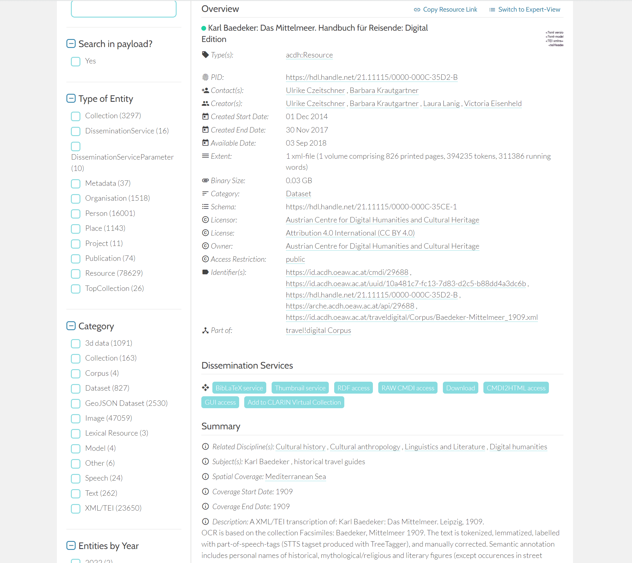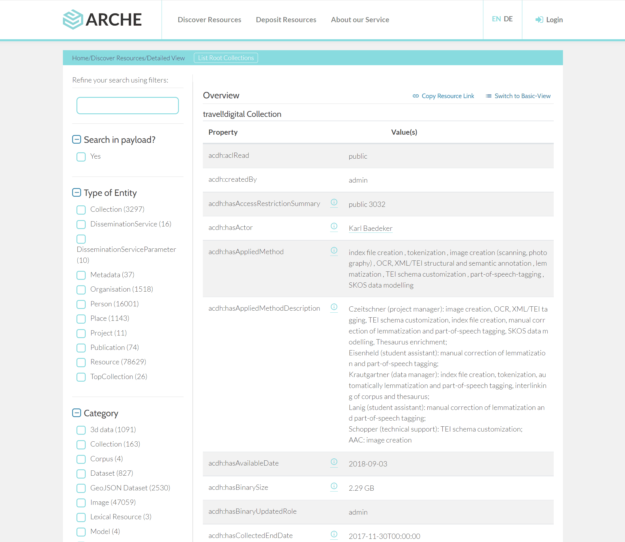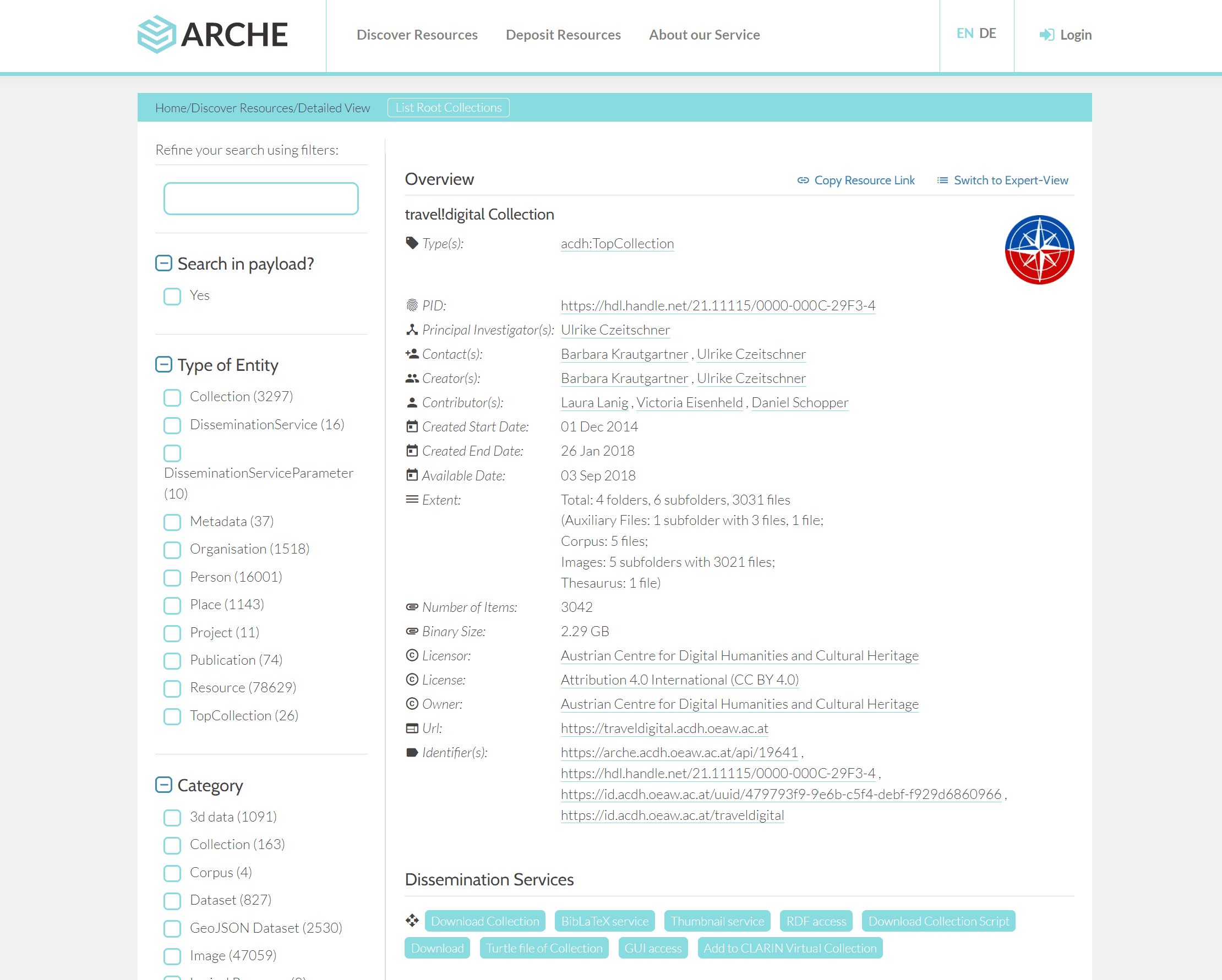 Unser hauseigenes Archiv am ACDH-CH ist ARCHE. Hier dargestellt, ist das Beispiel der travel!digital Collection.