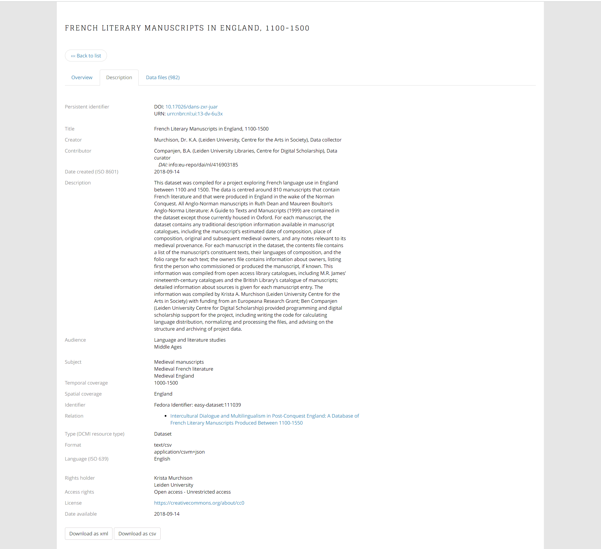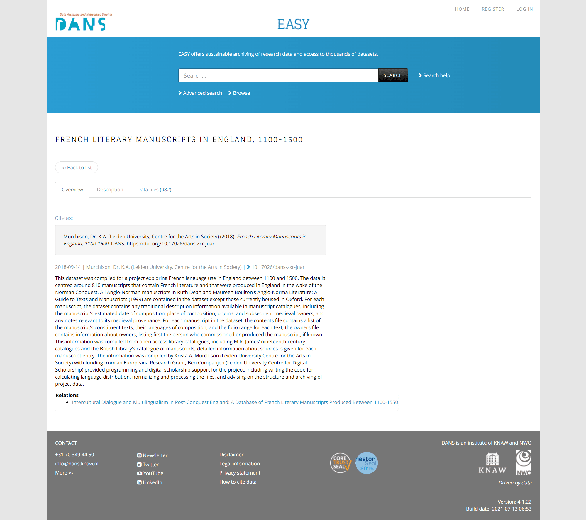 Übersichtsinformation der Datensammlung “French Literary Manuscripts in England, 1100-1500” in DANS.
