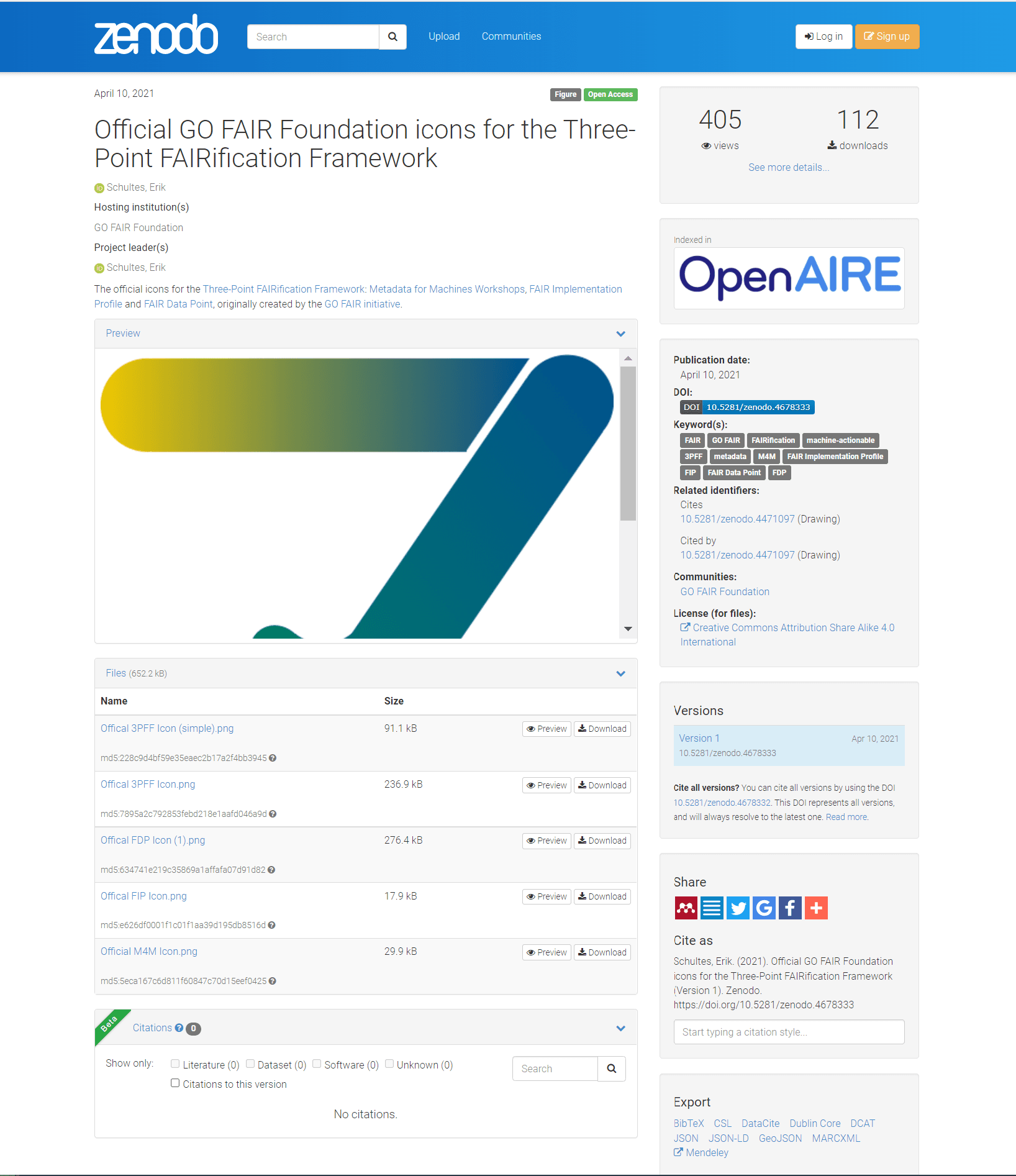Übersicht über die Sammlung “Official GO FAIR Foundation Icons for the Three-Point FAIRification Framework” auf Zenodo.