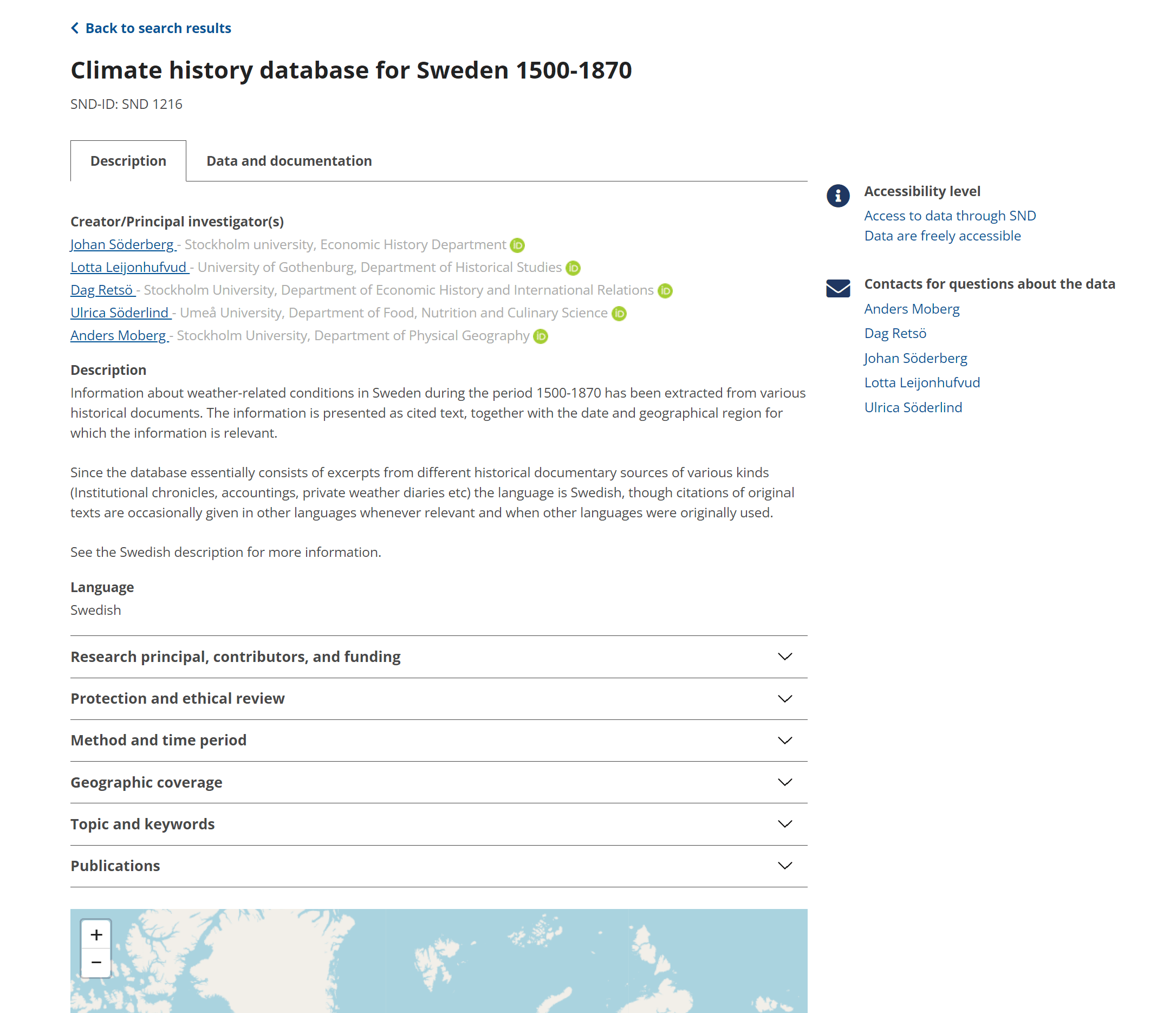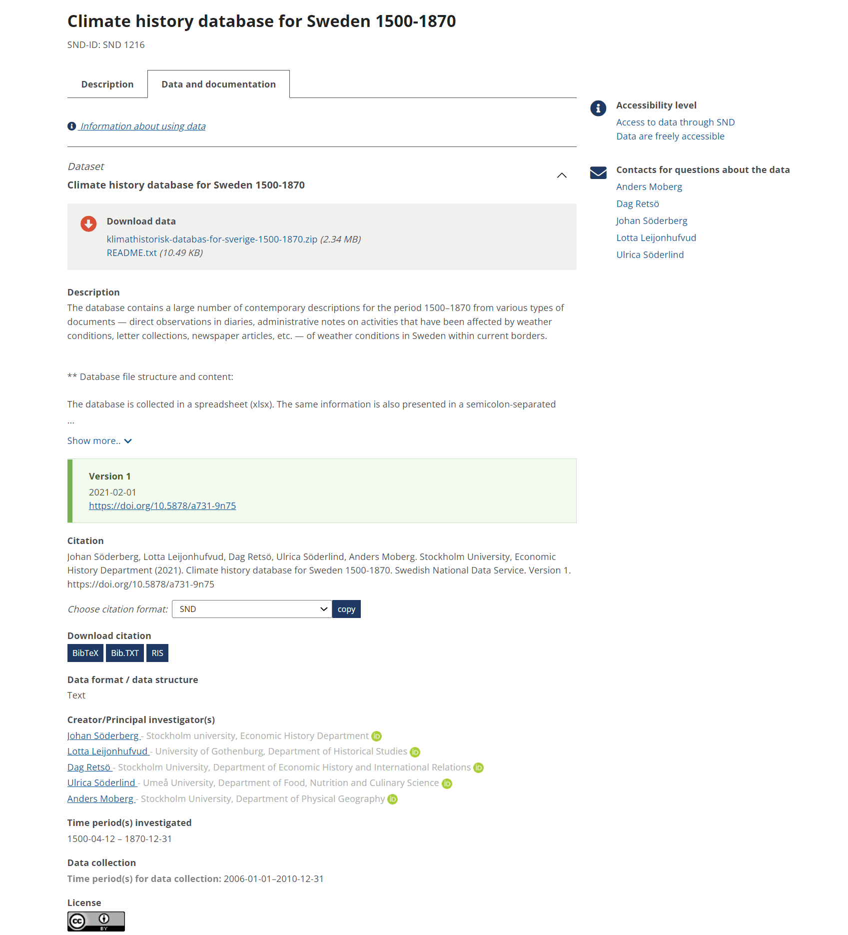 Das Beispiel des Swedish National Dataservice (SND) beinhaltet eine Datenbank mit aus historischen Dokumenten extrahierten Klimadaten. Es gibt die Reiter Beschreibung (Description) sowie Daten und ihre Dokumentation (Data and documentation). Letzterer wird zuerst angezeigt und beinhaltet einen Zitierhinweis mit der Option, sich das Zitat in bestimmten Zitierstilen oder Formaten (z.B. Harvard, BibTex oder RIS) herunterzuladen. Zudem finden sich weitere Eckdaten wie Information zu Personen, die an der Erstellung der Datensammlung beteiligt waren oder der Lizenzhinweis.
