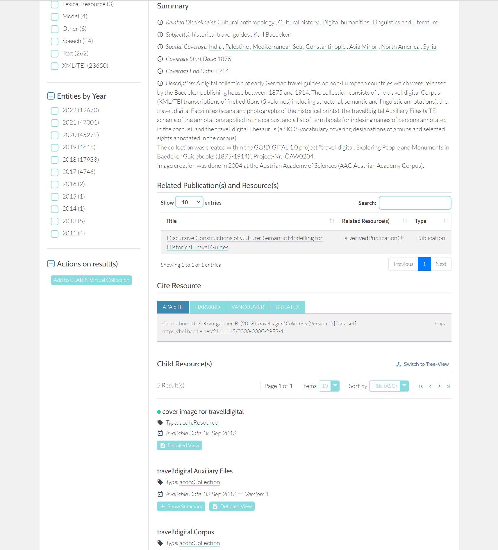 Zusammenfassung, Zitationshinweis und “Child-Resources” als Teil des Überblicks über die Sammlung “travel!digital” in ARCHE.