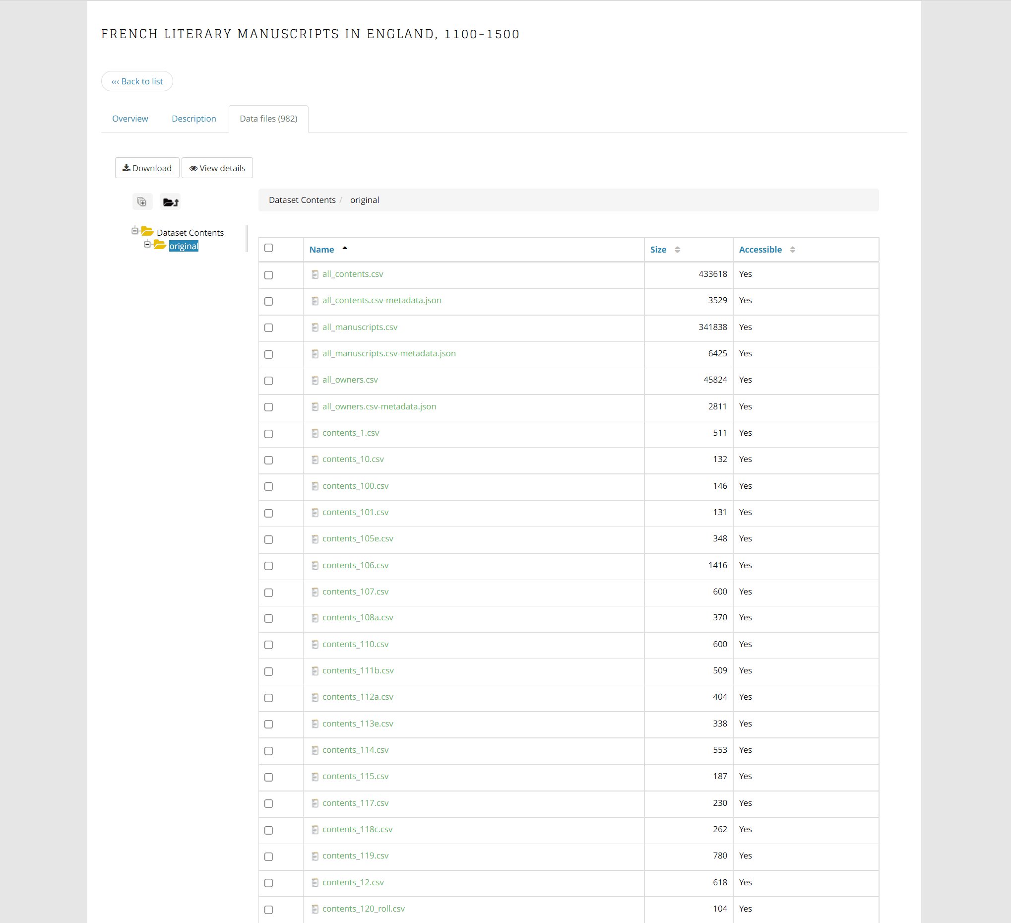 Dateienübersicht der Datensammlung “French Literary Manuscripts in England, 1100-1500” in DANS.
